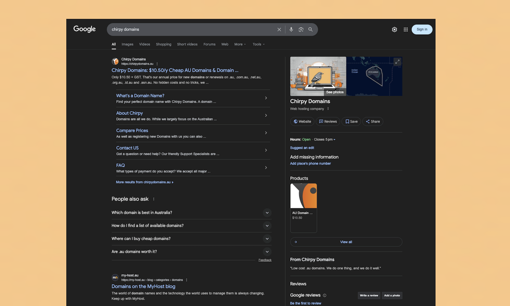 After the site was live we created our Google Business Profile. Now when people search for us by name, a handy box all about us appears on the right hand side of search results. We’ve also added our single product, AU Domain Names, as a product within that profile.