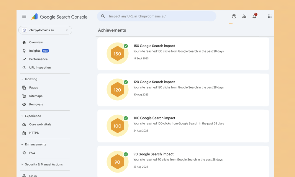 Before we went live with the Chirpy Domains website, we had a basic Google Analytics (GA4) property and Google Tag Manager installation working for us. We’ve also been tracking the site on Google’s Search Console.