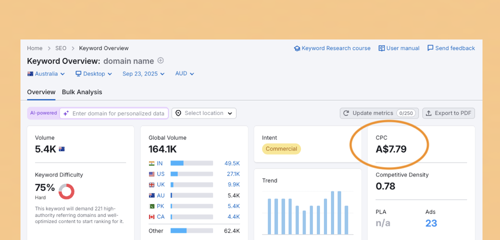 Semrush, a search marketing research tool, estimates if we ran search ads for the keyword “domain name”, each click would cost $7.79.