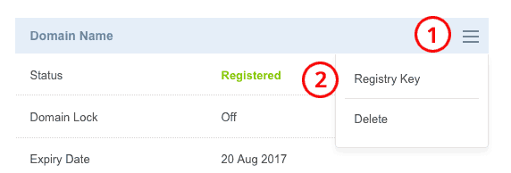 (1) Under the Domain Name box, click the hamburger icon.(2) Click the Registry Key link.